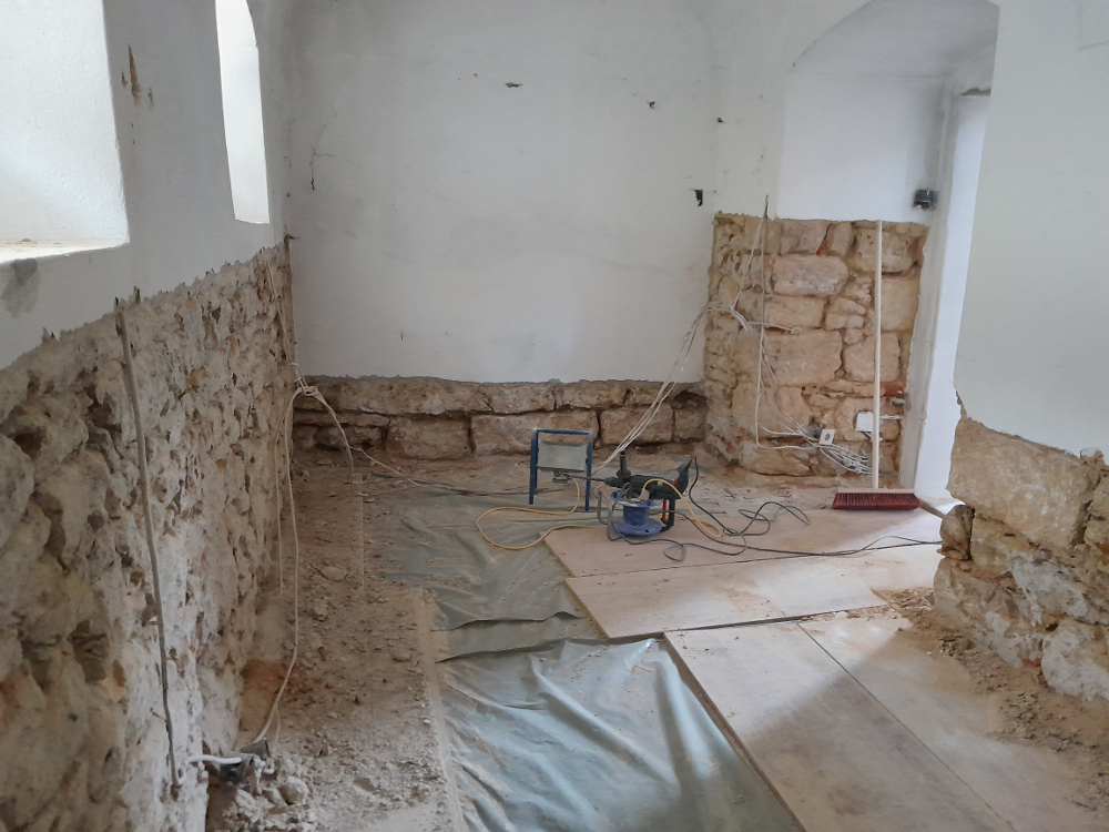 Restaurator H. Fromm hatte festgelegt, einen Teil des Sockelputzes abzuschlagen.